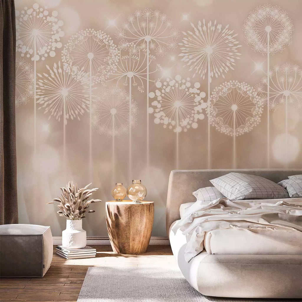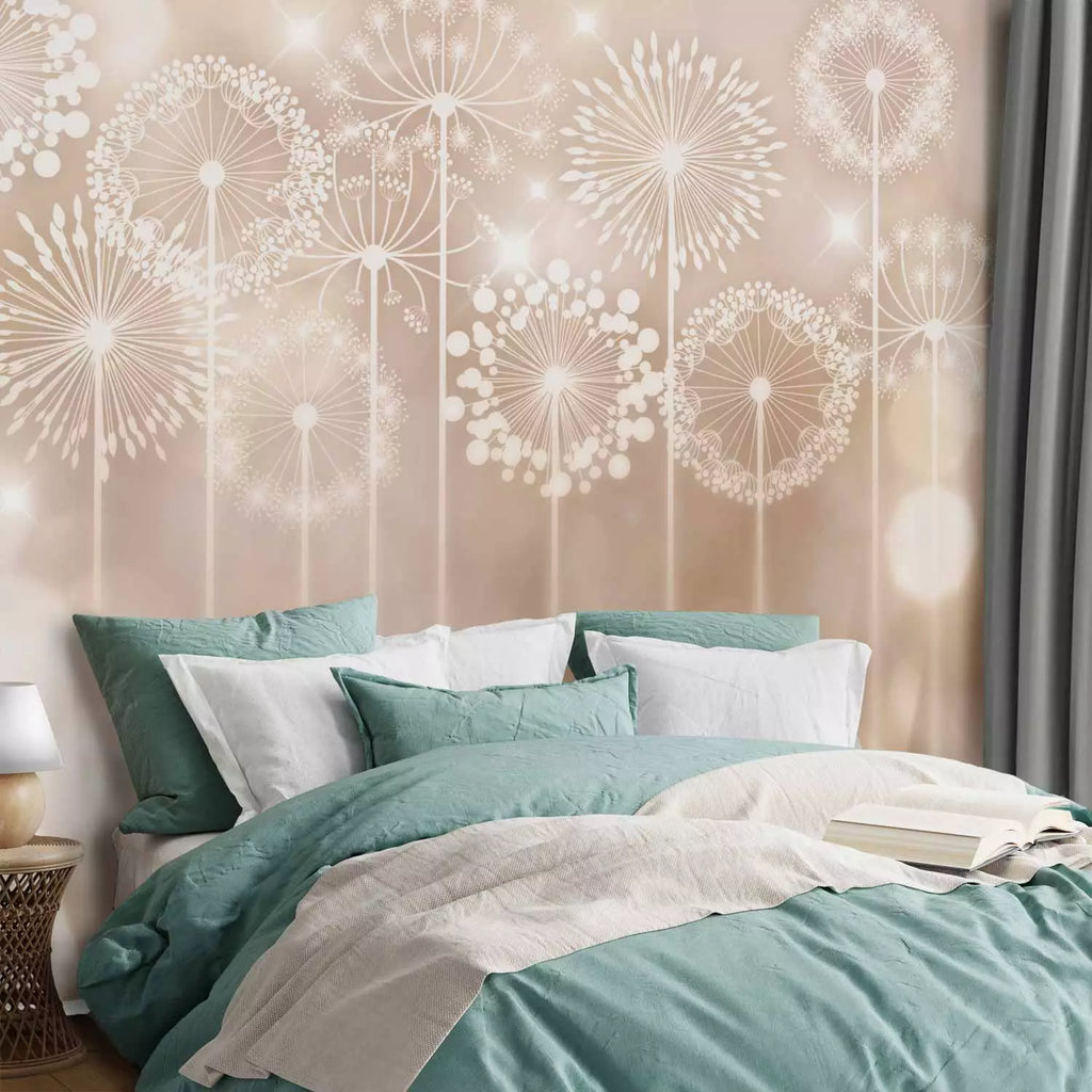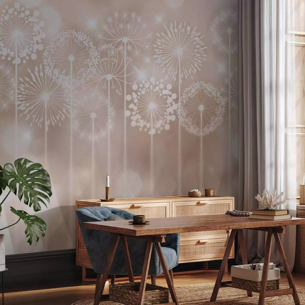 Pienenes simbolizē vieglumu un jaunu sākumu, un to gaisīgās pūkas uz neitrālā fona rada modernu, bet vienlaikus romantisku atmosfēru. Šis dizains lieliski iekļaujas skandināvu, boho vai klasiskajā interjerā, harmoniski papildinot koka mēbeles un dabīgus audumus.