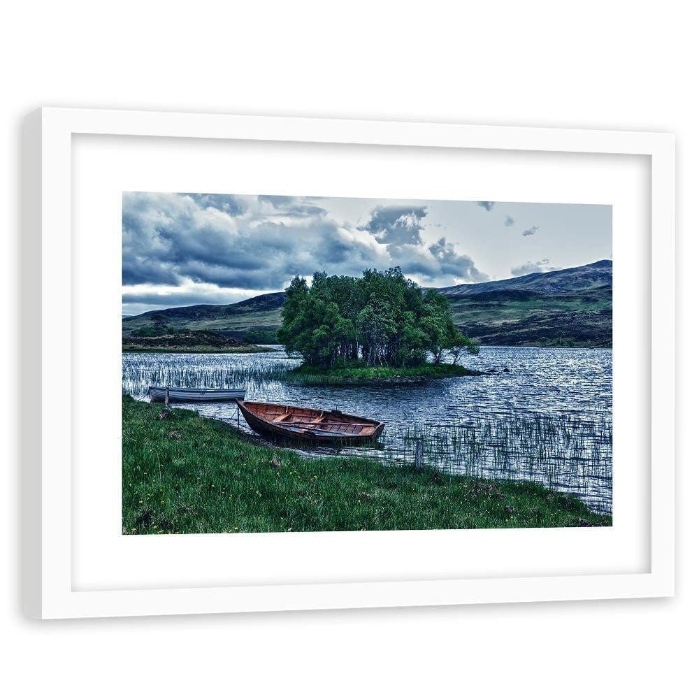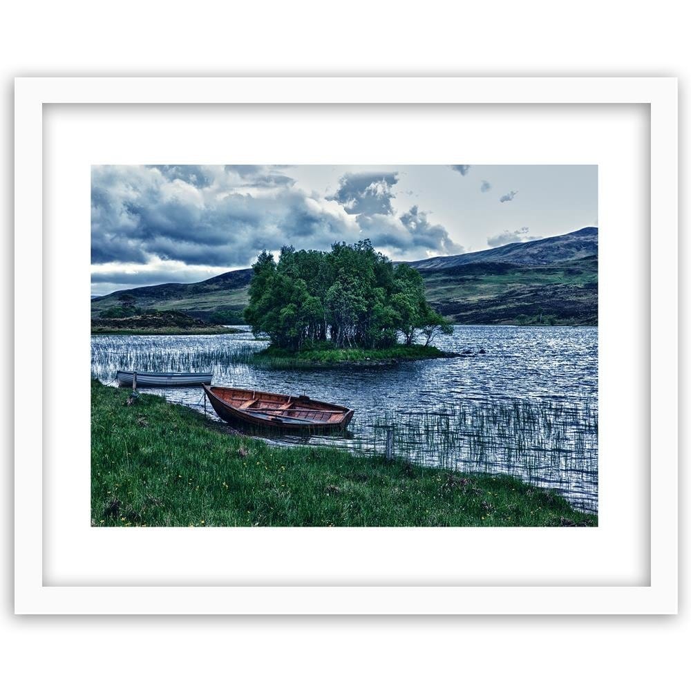 Glezna baltā rāmī - Boats On The Side Of A Mountain Lakes