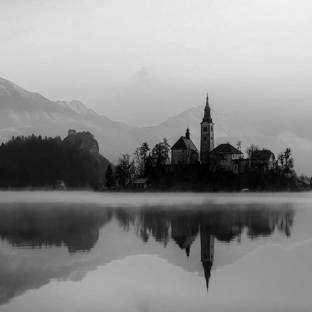 Glezna baltā rāmī - Castle Alpine Lake 2