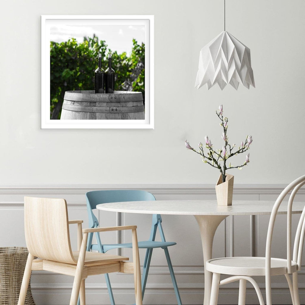 Glezna baltā rāmī - Wine Bottles On The Barrel 2