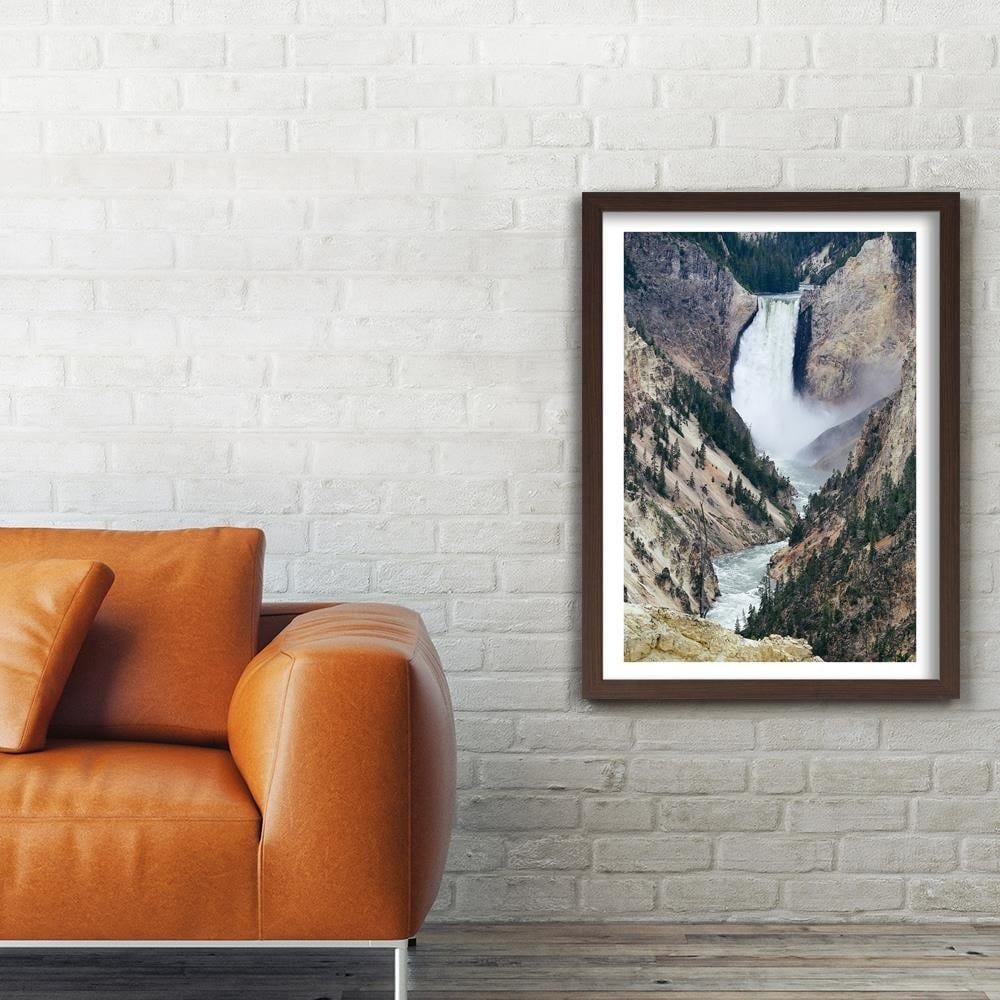 Glezna brūnā rāmī - Great Waterfall In The Mountains