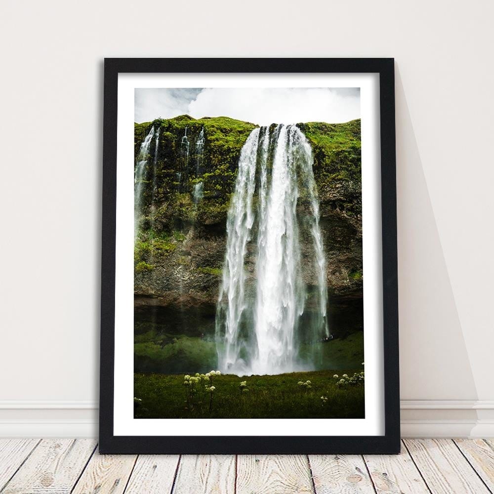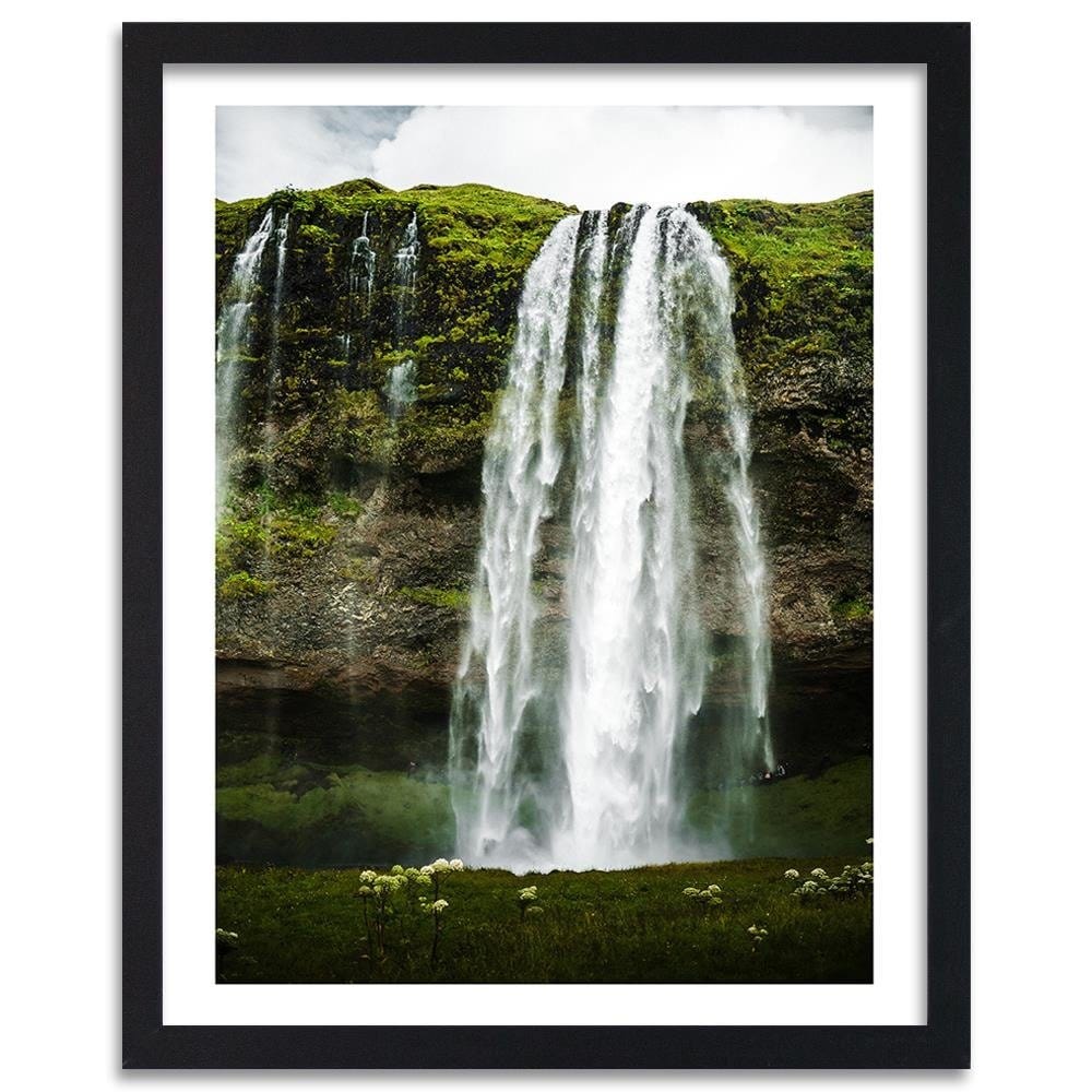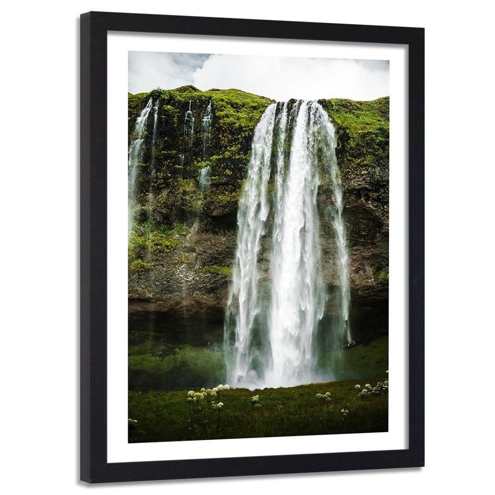 Glezna melnā rāmī - Green Waterfall In The Mountains