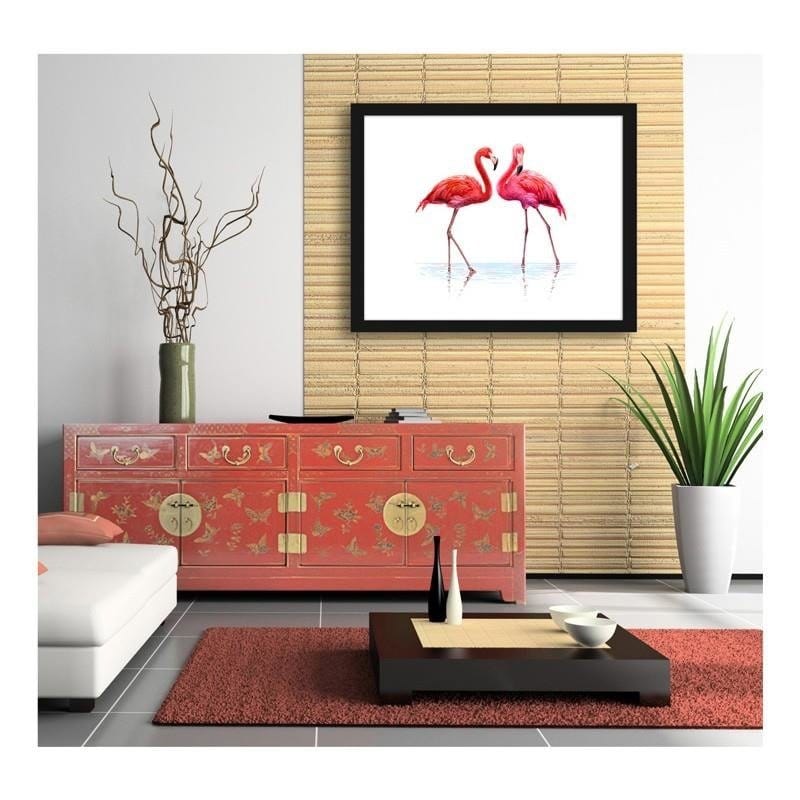 Glezna melnā rāmī - Realistic illustration of flamingos standing in the water