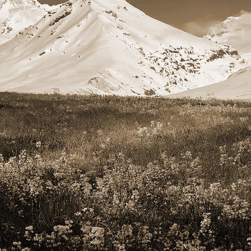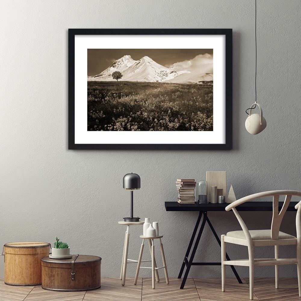 Glezna melnā rāmī - Snowy Mountains And Colorful Meadow 1