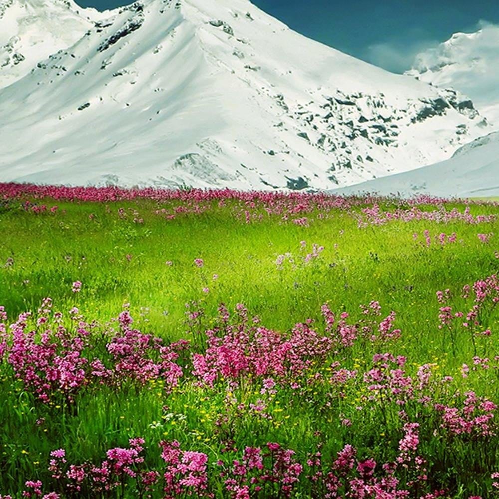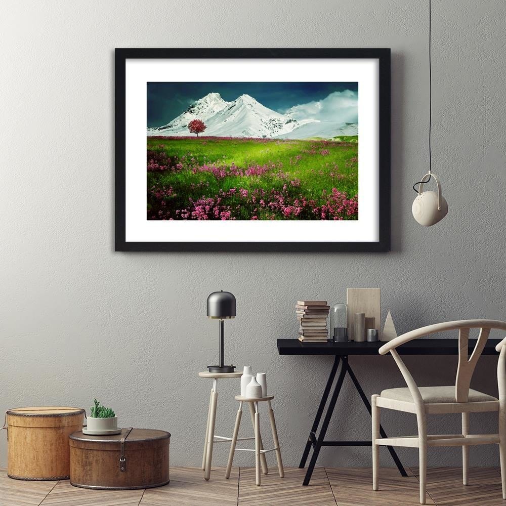 Glezna melnā rāmī - Snowy Mountains And Colorful Meadow 3