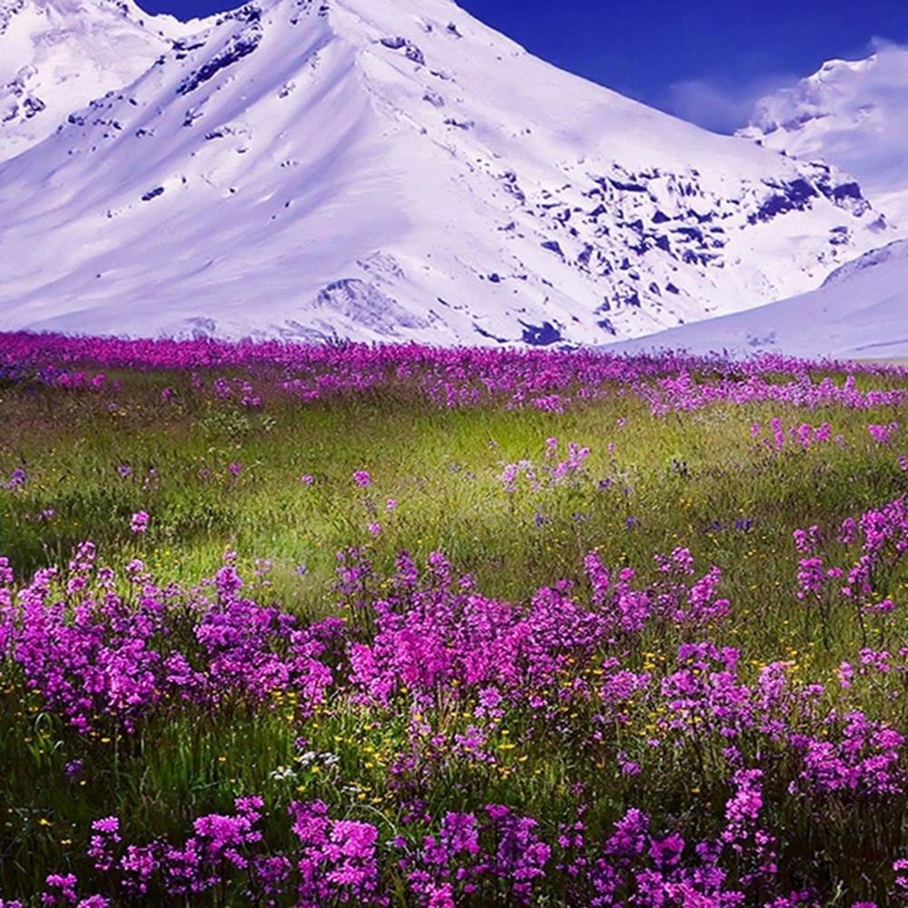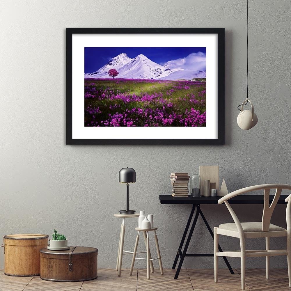 Glezna melnā rāmī - Snowy Mountains And Colorful Meadow 4