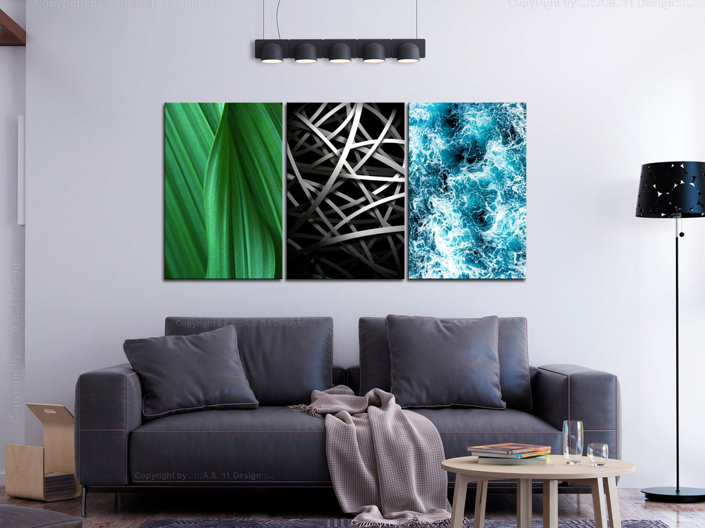 Augstas kvalitātes materiāli Kanva "Structures in Nature (3 Parts)" ir uzdrukāta uz speciāla flizelīna audekla, kas nevainojami atstaro krāsas. Izgatavotā kanva tiek uzstiepta uz viegla, bet stabila rāmja, kas ir izgatavots no videi draudzīgiem materiāliem. Augstas kvalitātes kanvas iegūst, izmantojot augstas kvalitātes drukas iekārtu, kas nodrošina spilgtas un dzīvīgas krāsas, un neatkarīgi no kanvas formāta tajā ir nevainojami reproducētas visas detaļas.
