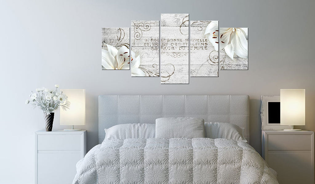 Ļaujiet kanvai "White lilies on wood" ienest jaunas vēsmas jūsu un jums tuvo cilvēku mājās!